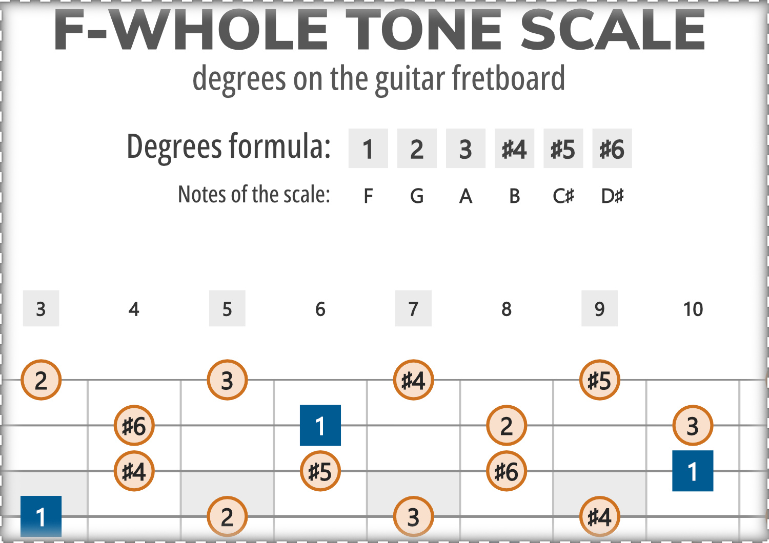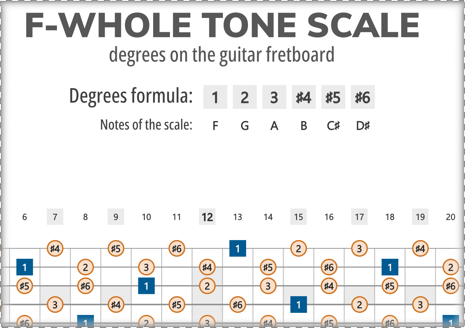 F-Whole Tone consists of the notes F, G, A, B, C#, D#, and its scale-degree formula is 1-2-3-#4-#5-#6.