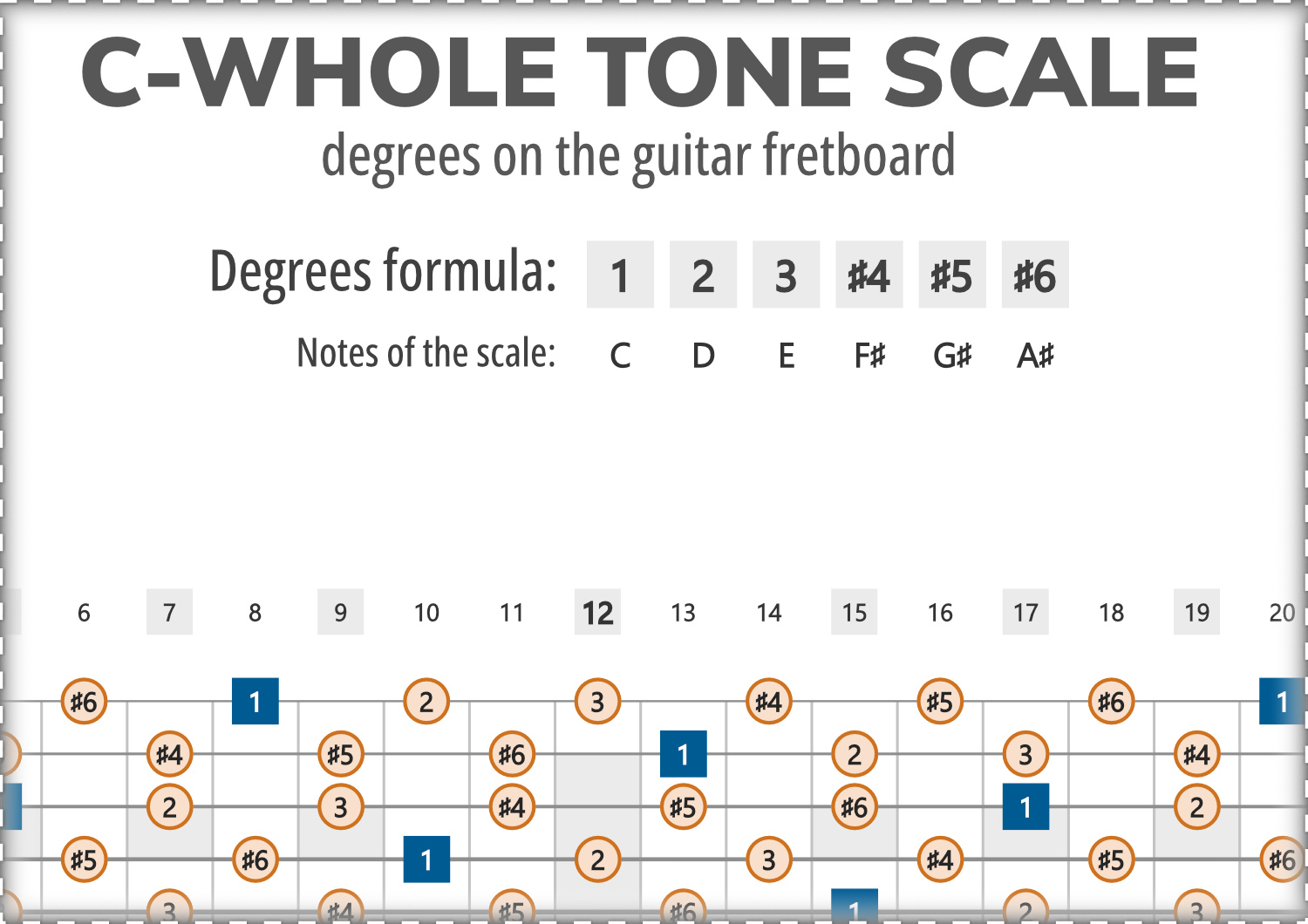 C-Whole Tone consists of the notes C, D, E, F#, G#, A#, and its scale-degree formula is 1-2-3-#4-#5-#6.
